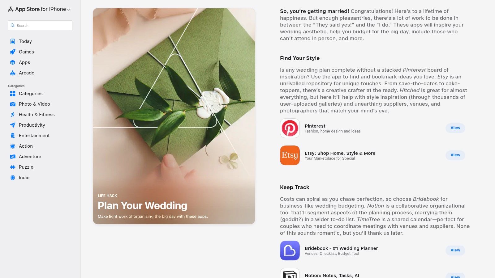 | Apple App Store ("Plan Your Wedding" hub) | Curated editorial app recommendations, direct installs, reviews | Trusted Apple vetting, seamless iOS installs, editorial guidance | iPhone/iPad users discovering vetted wedding apps | Free discovery hub; value = curation & reviews |