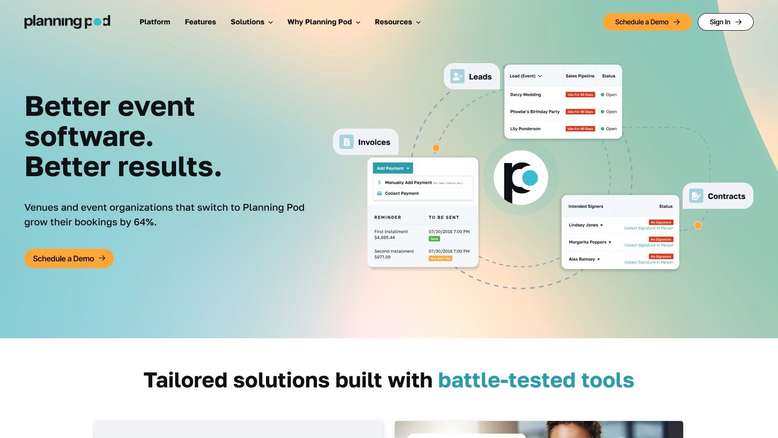 | Planning Pod – Event management platform | Floor plans, seating charts, event websites, invoicing, reporting | Web-first, mobile‑responsive, built for complex events | Planners, venues, large/complex weddings & corporate events | Package pricing based on usage; end‑to‑end event operations |