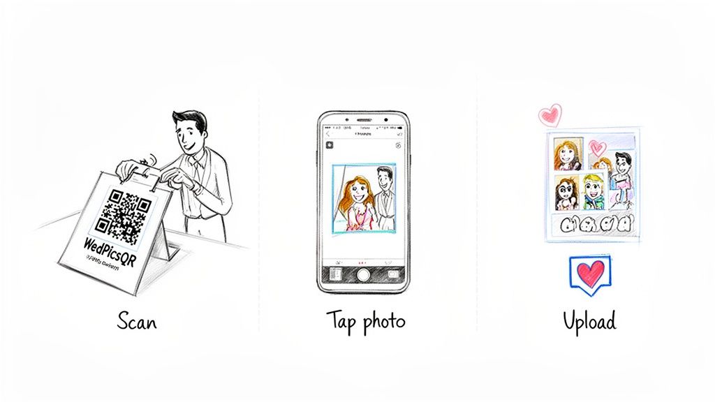 Let’s be honest: guests shouldn't have to work to share their memories. If there’s any friction—like downloading an app or creating an account—you’ll lose participation and end up with a sparse photo gallery. The secret is the seamless consolidation of all those photos through a simple QR code.