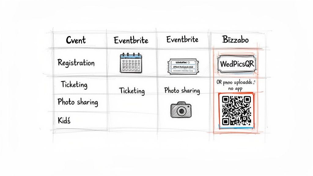 When you're comparing event management software, it usually boils down to a classic trade-off: do you want a powerhouse for logistics or a smooth, seamless experience for your guests? The truth is, the best solution is rarely just one piece of software. It’s about finding a smart combination that nails the complex planning side without making things a headache for attendees—especially when it comes to capturing memories with incredible ease of use.