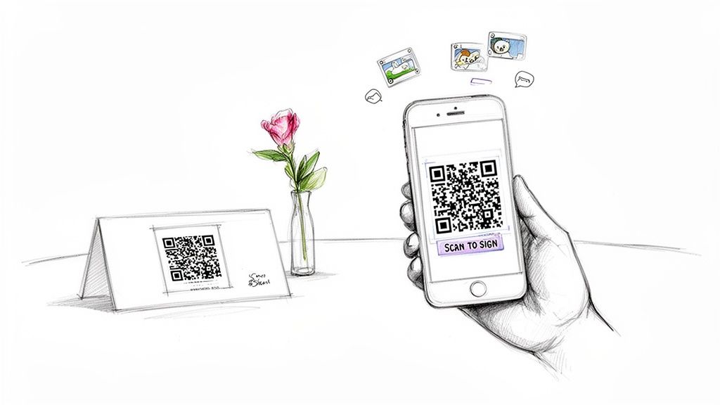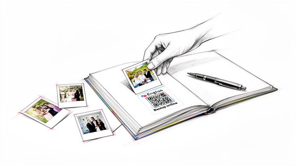 This method creates a deeply personal and immersive keepsake. Instead of just reading well-wishes, you get to relive the moments and hear the genuine sentiment in your loved ones' voices. Platforms like WedPicsQR facilitate this by allowing guests to upload video messages directly to your shared event album without needing to download an app, making it one of the most touching guest book creative ideas. This ease of use encourages even camera-shy guests to participate.