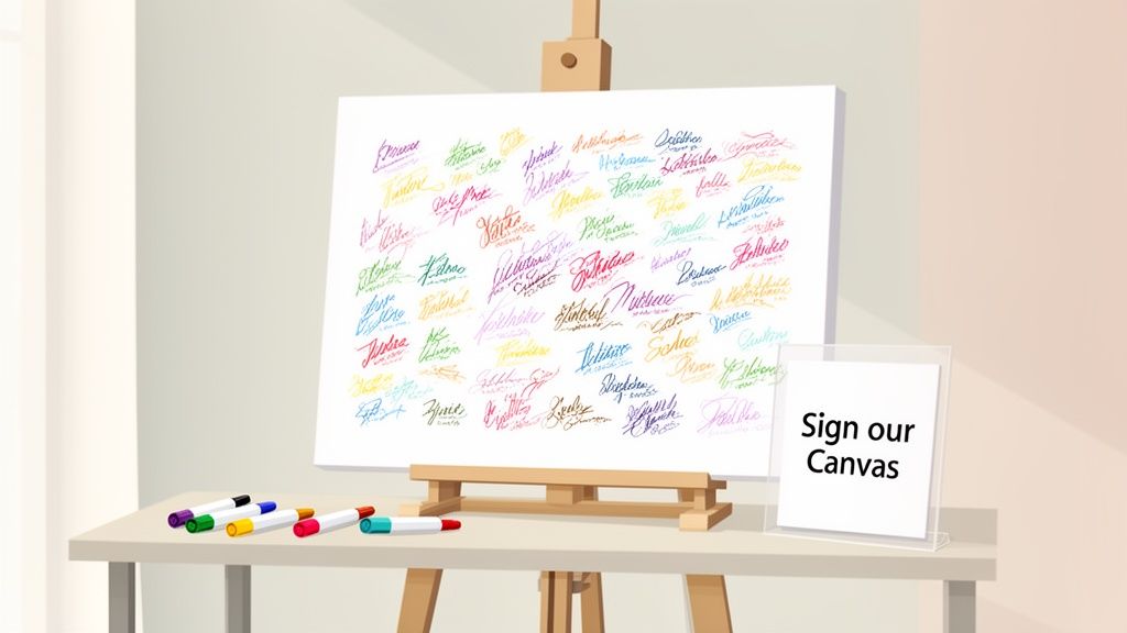 This artistic approach is one of the most personal guest book ideas for wedding celebrations, as it integrates seamlessly with your home decor. Imagine a beautiful wooden plank signed by guests at your rustic barn wedding or a sleek, minimalist canvas from your modern city celebration hanging above your fireplace. It’s a constant, visual reminder of your special day, and just as effective for family reunions or anniversary parties.
