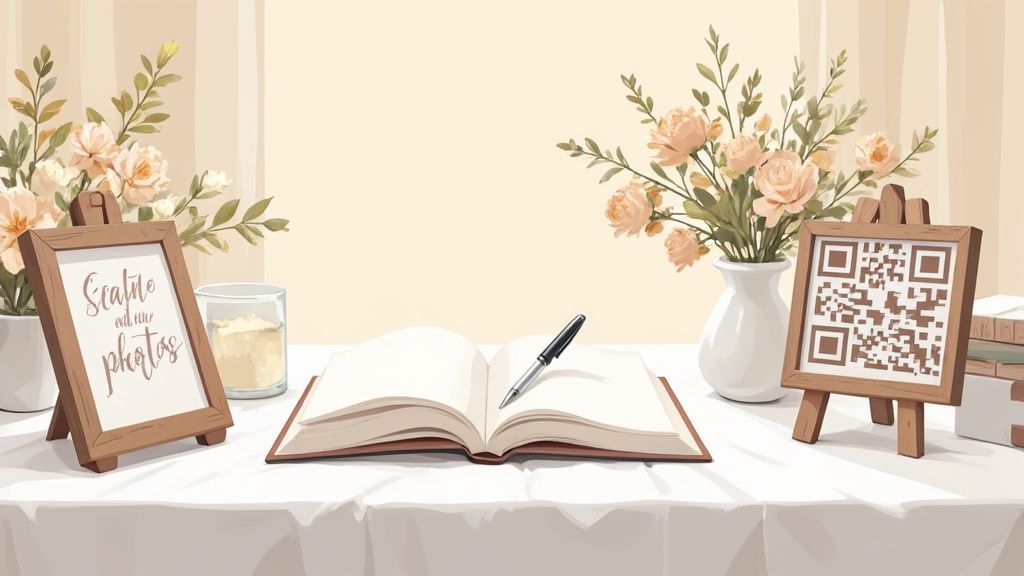 One of the most powerful options available today is the digital guest book, which uses a simple QR code to create a living, breathing album of your event. This approach basically turns every single guest into a roving photographer, capturing priceless candid moments from their unique perspective—whether they're at their table, on the dance floor, or hitting up the photo booth.