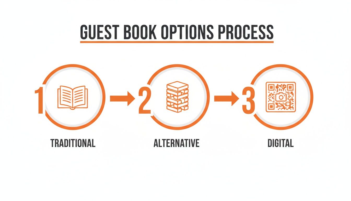 This flowchart really shows how guest books have evolved, moving from the traditional book to more dynamic options like digital QR codes.
