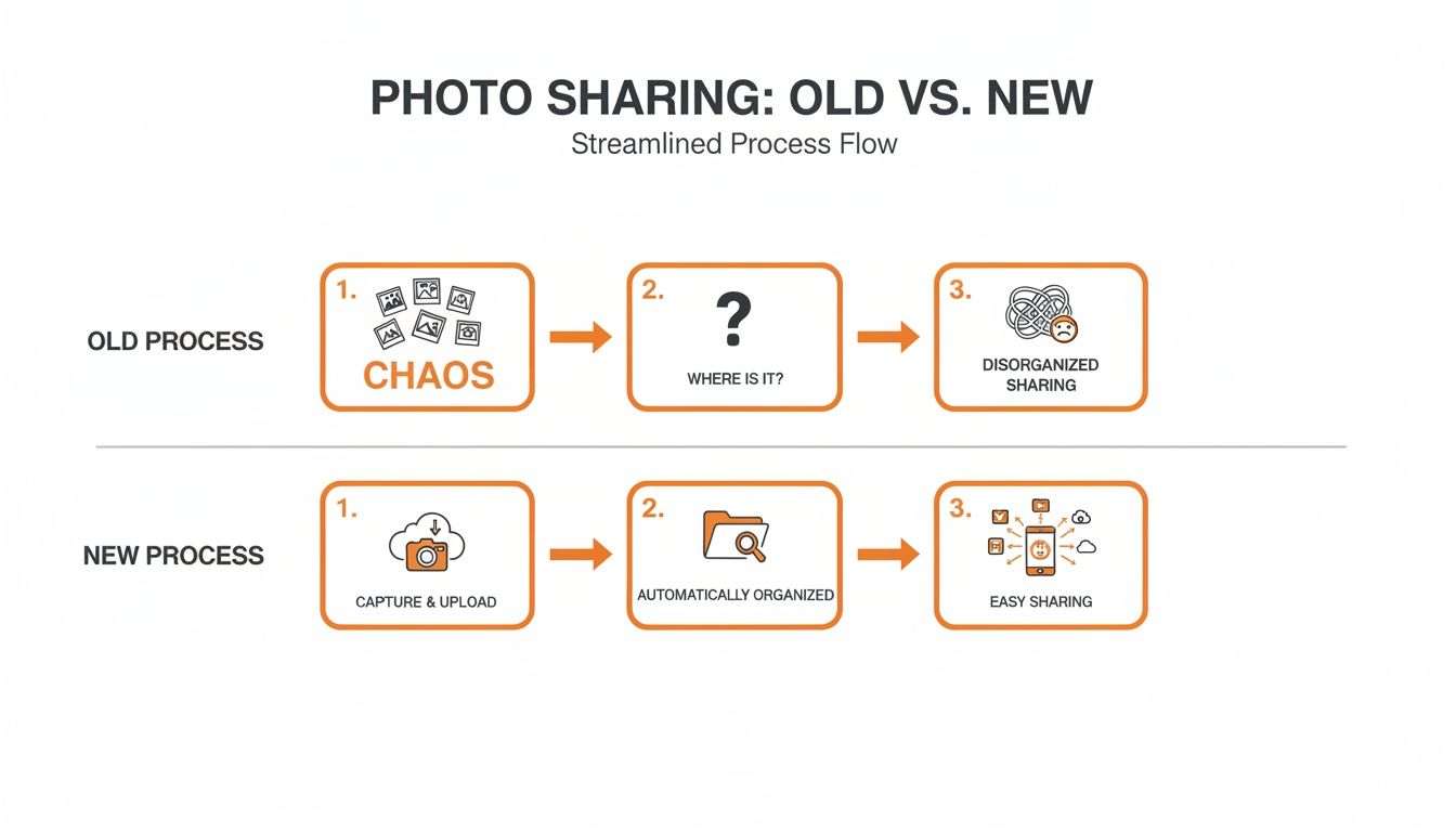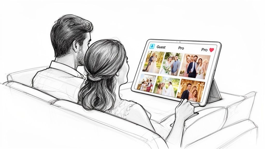 You come up with a clever hashtag, but the photos end up scattered across social media, mixed in with public posts, or worse, hidden behind private accounts. So, you start sending follow-up texts and emails, feeling like you're nagging your friends and family for pictures they swore they'd send weeks ago. This whole process turns collecting memories into a total chore. You can find more details on avoiding these headaches in our guide on common wedding photo sharing problems and how to solve them.